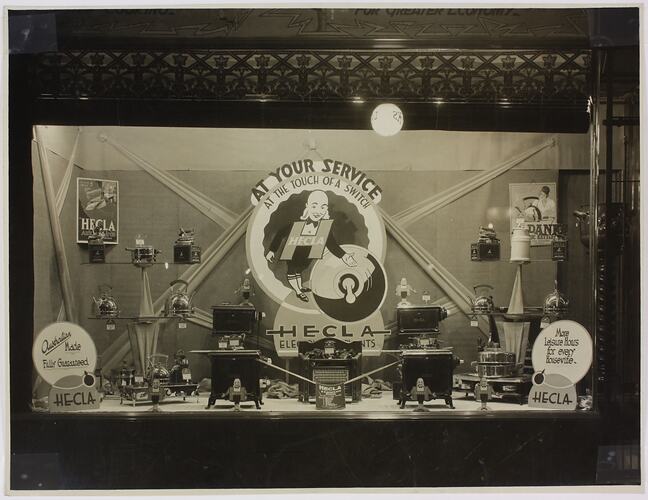 Hecla Electrics manufactured and distributed a wide range of domestic and commercial electric appliances products to Australasia, such as heaters, kettles, toasters, stoves and water heaters. Its client base included households, commercial businesses such as cafés, hospitals and offices, as well as the military. The company promoted its goods through advertisements in home magazines and displays in shop windows, home shows and the 1935 All-Electricity Exhibition. Hecla Electrics became a household name in Melbourne during the 1920s and remained a popular Australian brand until the late 20th century.'