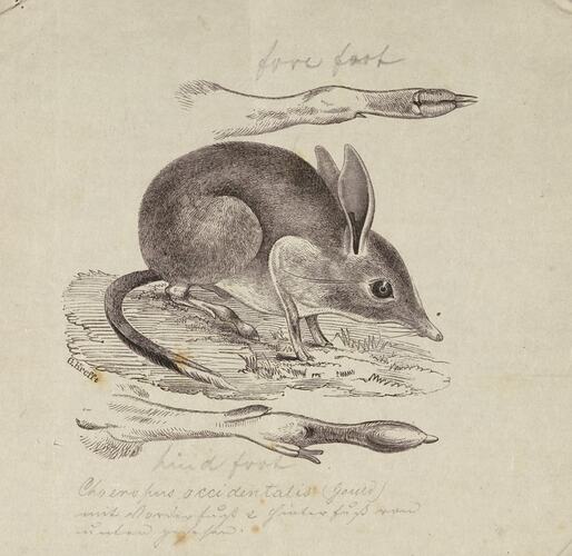 This wood engraving by Gerard Krefft of a Pig-footed Bandicoot, Chaeropus ecaudatus, was the result of an historic scientific expedition to north west Victoria in 1857. Museum Victoria's first curator William Blandowski led the remarkable survey to the junction of the Murray and Darling rivers and set up camp at Mondellimin (now known as Chaffey's Landing), just eight kilometres west of the centre of the city of Mildura in Victoria. The expedition dispatched more than 17,000 specimens to Melbourne and unlike the ill fated Burke and Wills expedition that followed in 1860, the entire party returned alive. Blandowski's gifted assistant on the expedition, Gerard Krefft, documented their findings and illustrated a number of species, including the Pig-footed Banidcoot which are now extinct.