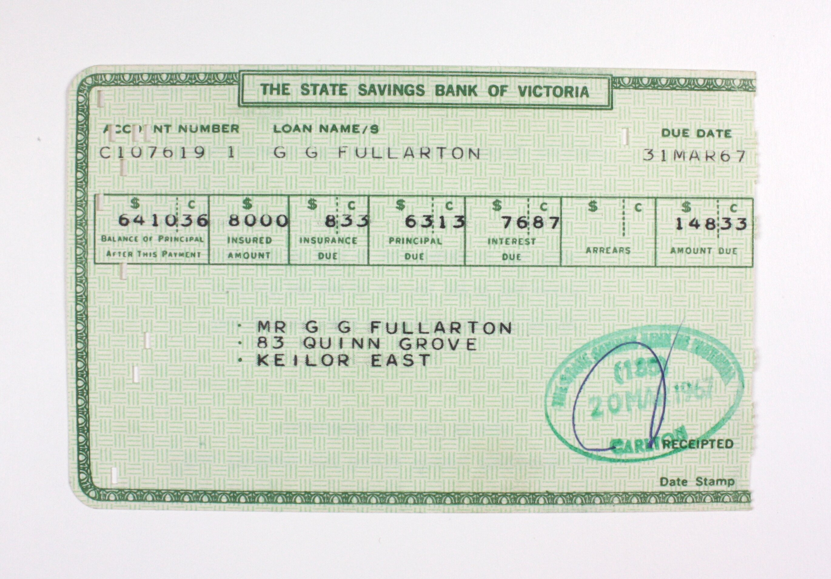 One of nine mortgage receipts from State Savings Bank of Victoria to Mr Graeme Fullarton, for his house mortgage on 83 Quinn Grove, Keilor East. This was issued on 31 March 1967 for the amount of $148.33.