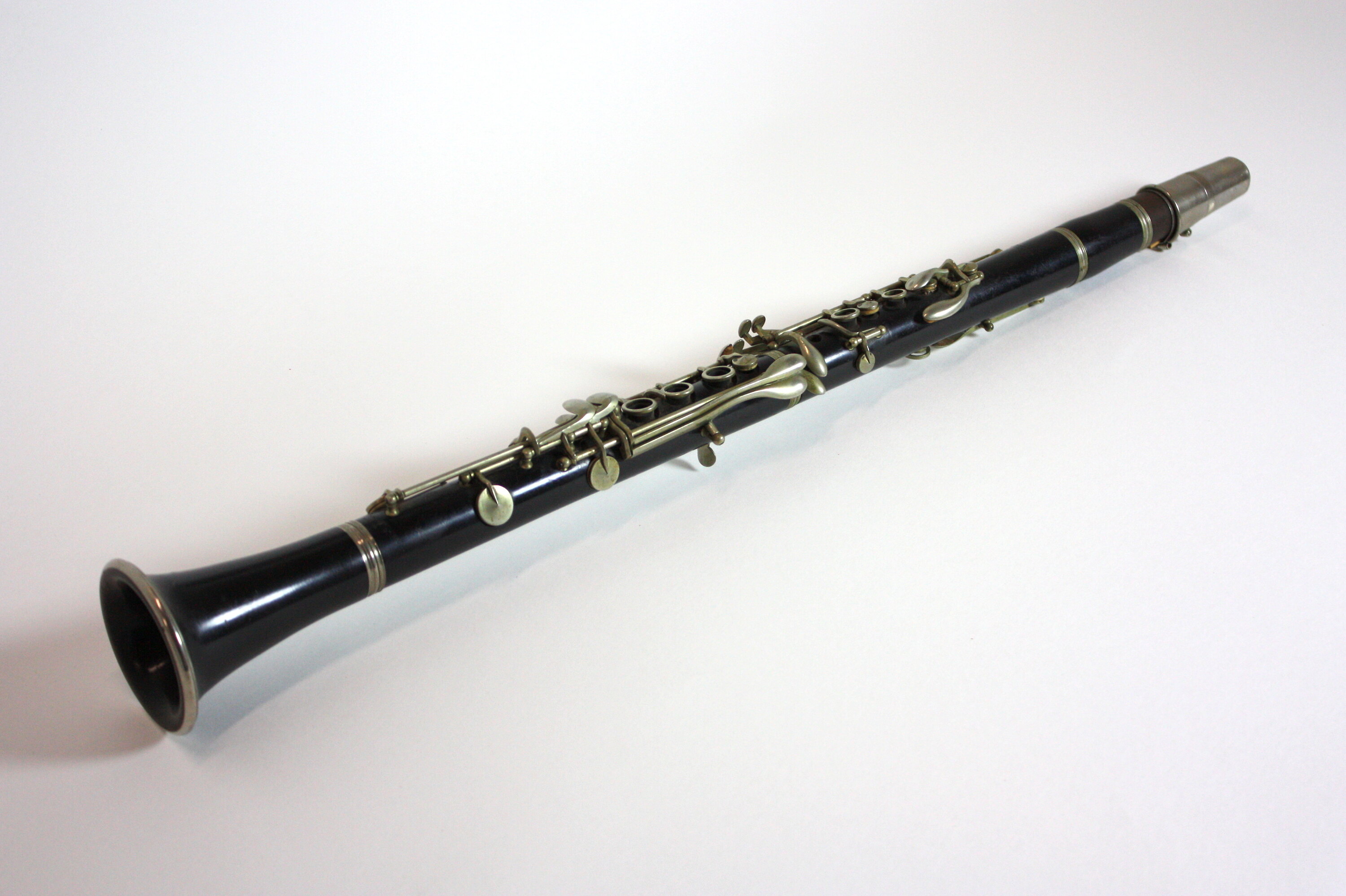 Black wood clarinet with silver metal keys. Separates into five pieces with silver metal mouth piece cap. Mouth piece and barrel sections do not separate easily. Reed at mouthpiece, with slight loss on thin edge. Mouthpiece of different wood, and therefore probably a replacement.