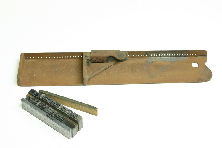 A setting stick consists of a right-angled piece of metal with a graduation along which to set the type. This particular stick is rusty