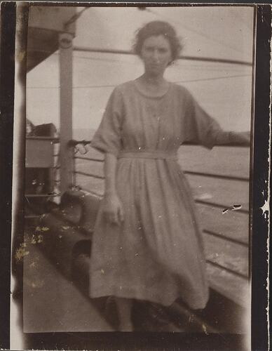 Black and white photograph of Gladys Leichti, standing by the ship rail on board the SS Bendigo in 1924. The image was taken during her voyage as an assisted immigrant from England to Australia.