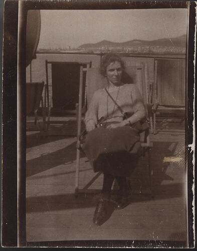 Gladys Leichti seated on a deckchair on board the 'SS Bendigo'. There is a port in the background. She wears a jumper and long skirt.