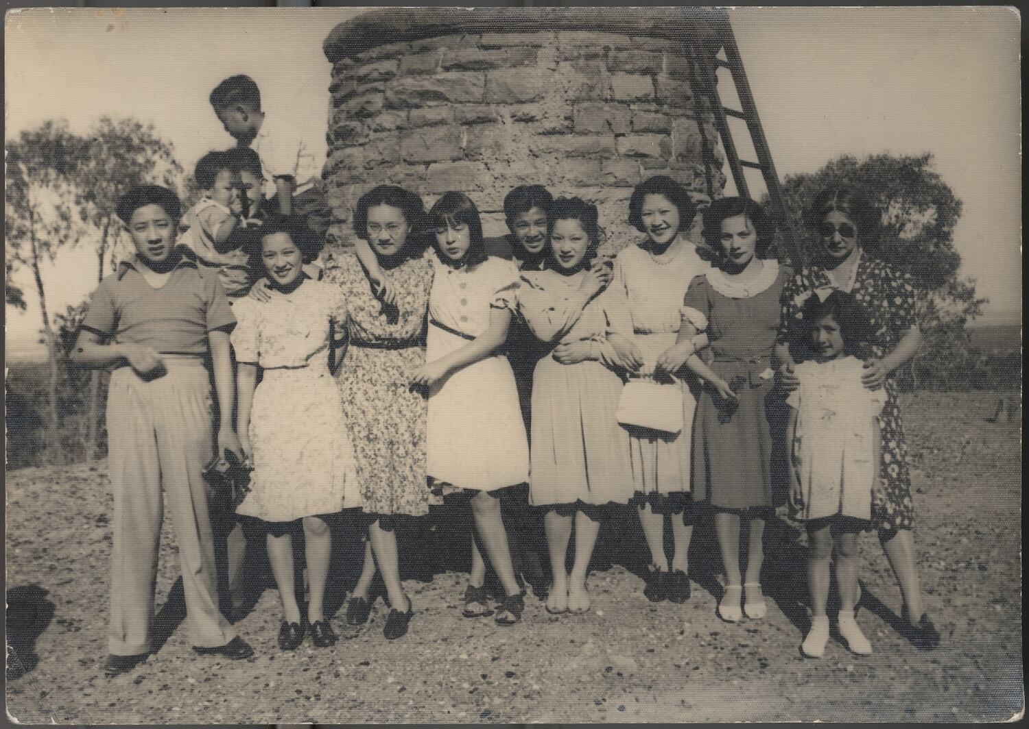 Photograph of the Gung family standing in front of stone wall and ladder. It was taken at Lake Mountain, circa 1930s-40s. The Gung family collection documents their experiences of immigrating and living in Australia from the 1920s to the 1960s and the gradual easing of the White Australia policy.