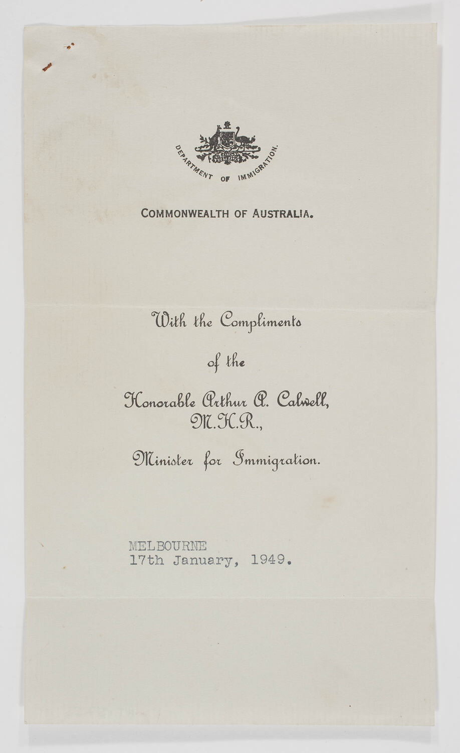 Text: DEPARTMENT OF IMMIGRATION/COMMONWEALTH OF AUSTRALIA./With the Compliments/of the/Honorable Arthur A. Calwell,/M.H.R.,/Minister for Immigration./MELBOURNE/17th January, 1949.