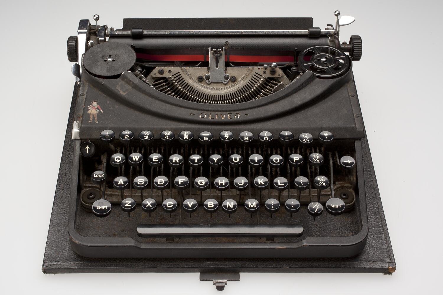 This is a portable typewriter of the type-bar class, manufactured by the Oliver Typewriter Company of England. An instruction manual is clipped to the inside of the typewriter case lid.
