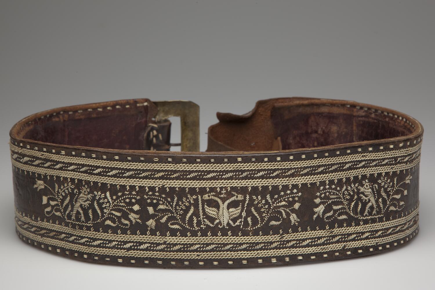 Men's brown leather belt, part of a full Tyrolean costume, made circa 1890s and worn by Heinrich Wieser. The other items from the costume were returned to relatives in Tyrol. Heinrich brought it with him when he migrated to Australia from Germany with his family in 1951. Although he was of German ethnicity, growing up and living in South Tyrol meant Heinrich's citizenship was unclear, considered an Italian citizen prior to World War II after the war he was alternately considered to have Italian and German citizenship. Heinrich found it difficult to settle in Australia and moved to Papua New Guinea before returning to South Tyrol in 1958.