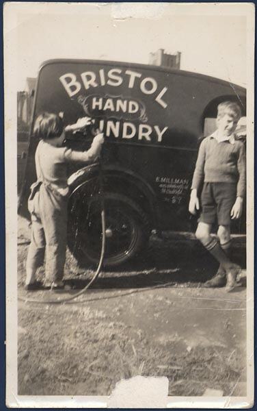 A girl and a boy standing alongside the Bristol Hand Laundry delivery van. The girl is washing the van and the boy is leaning on the vehicle near the driver's door. The van bears the firm's name and address: 'E. Millman, 415 Glenhuntly Road, South Caulfield'. Elsie Maude Ada Millman was the holder of the boiler's licence, and according to the family was the first woman in Victoria to hold such a licence. The Austin Seven car was purchased brand new by Elsie Millman in about the late 1920s. It ran on a gas producer or coke. The laundry business started in 1934 in Malvern, at the back of a house rented by the Millman family. They moved to a shop in Malvern. During World War II Mr Millman 'joined up the business' with Mr Masters because there was a labour shortage due to the war. Betsy Millman, the eldest daughter left school at age 13 to work in the laundry due to the lack of labour. The laundry stopped operating in the early -mid 1950s after Elsie and William Millman died. Electric washing machines such as the Baby Hoover meant that customers were increasingly doing their own laundry at home without starching and pressing their laundry. William Millman owned a laundry business in partnership with another man, Mr Masters, in Bank Street in South Melbourne, which was a large factory behind his home. After this Mr Millman operated a laundry by himself in Chapel Street in St Kilda and then moved to Caulfield.