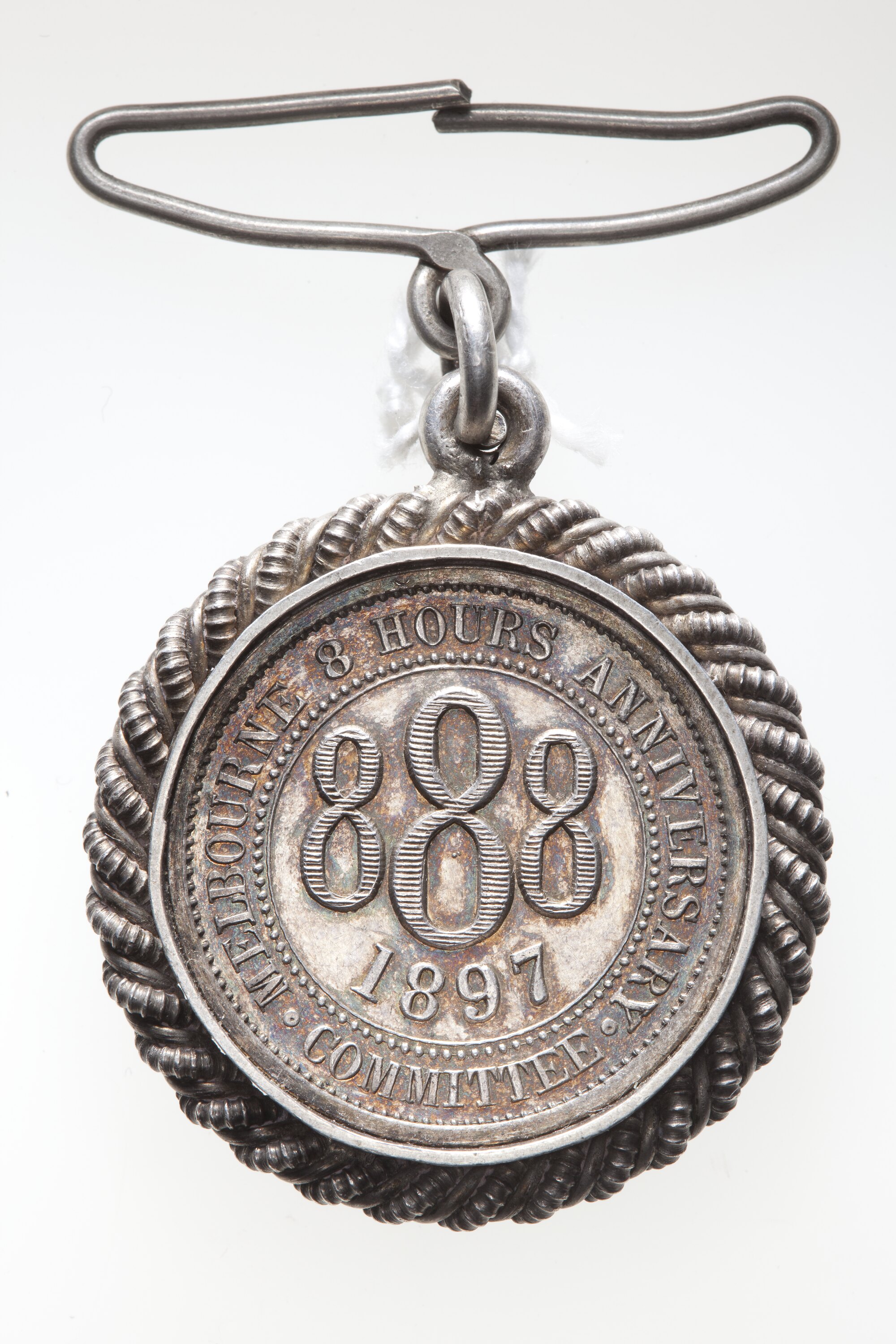 Medal awarded by the Melbourne Eight Hours Anniversary Committee to Stephen Barker in 1897. Barker at the time was president of the Trades Hall Council and a member of the Eight Hours Committee.