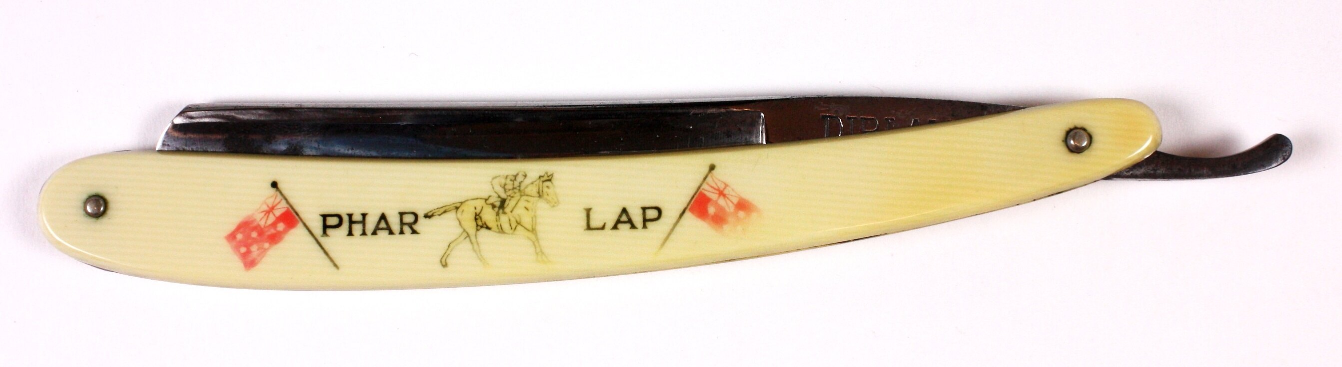 Razor made by J. Dirlam & Sons, in Germany in the 1930s. It has an image of Phar Lap and his name printed on one side.
