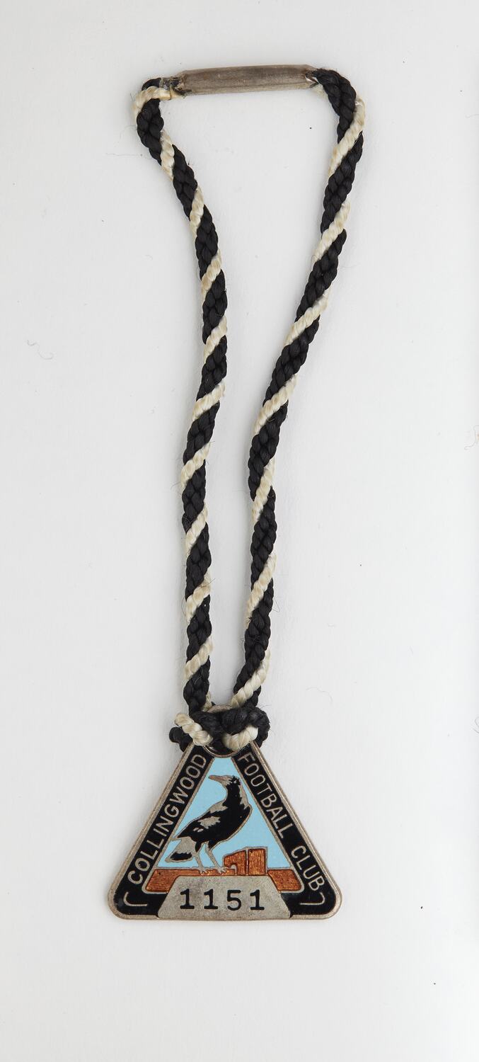 Medal, triangular shaped, and features enamel work consisting of a black magpie against a light blue background, with 'Collingwood Football club' inscribed around the edge, on a black background with 'member number '1151' inscribed at base. Black and white cord attached to ring at top.