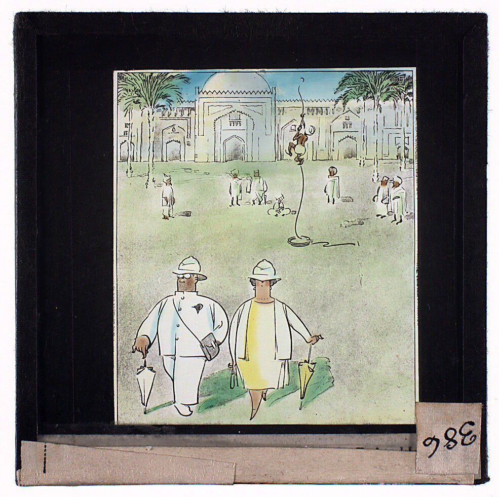Colour glass lantern slide of a sketch of a male and female tourist, with a rope climber and Indian scene in the background.