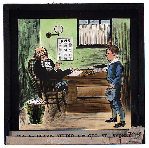 Lantern slide of a cartoon drawing of a man and a boy in an '1853' setting. Made by Beavis Studio, Sydney, New South Wales, circa 1930s-1940s.