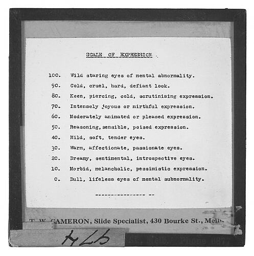 Text, on slide: SCALE OF EXPRESSION/100. Wild staring eyes of mental abnormality/90. Cold, cruel, hard, defiant look./80. Keen, piercing, cold, scrutinising expression./70. Intensely joyous or mirthful expression./60. Moderately animated or pleased expression./50. REasoning, sensible, poised expression./40. Mild, soft, tender eyes./30. Warm, affectionate, passionate eyes./20. Dreamy, sentimental, introspective eyes./10. Morbid, melancholic, pessimistic expression./0. Dull, lifeless eyes of mental subnormality. Text, edge of slide: T.W. CAMERON, Slide Specialist, 430 Bourke St., Melb. Text on attached label: '974'.