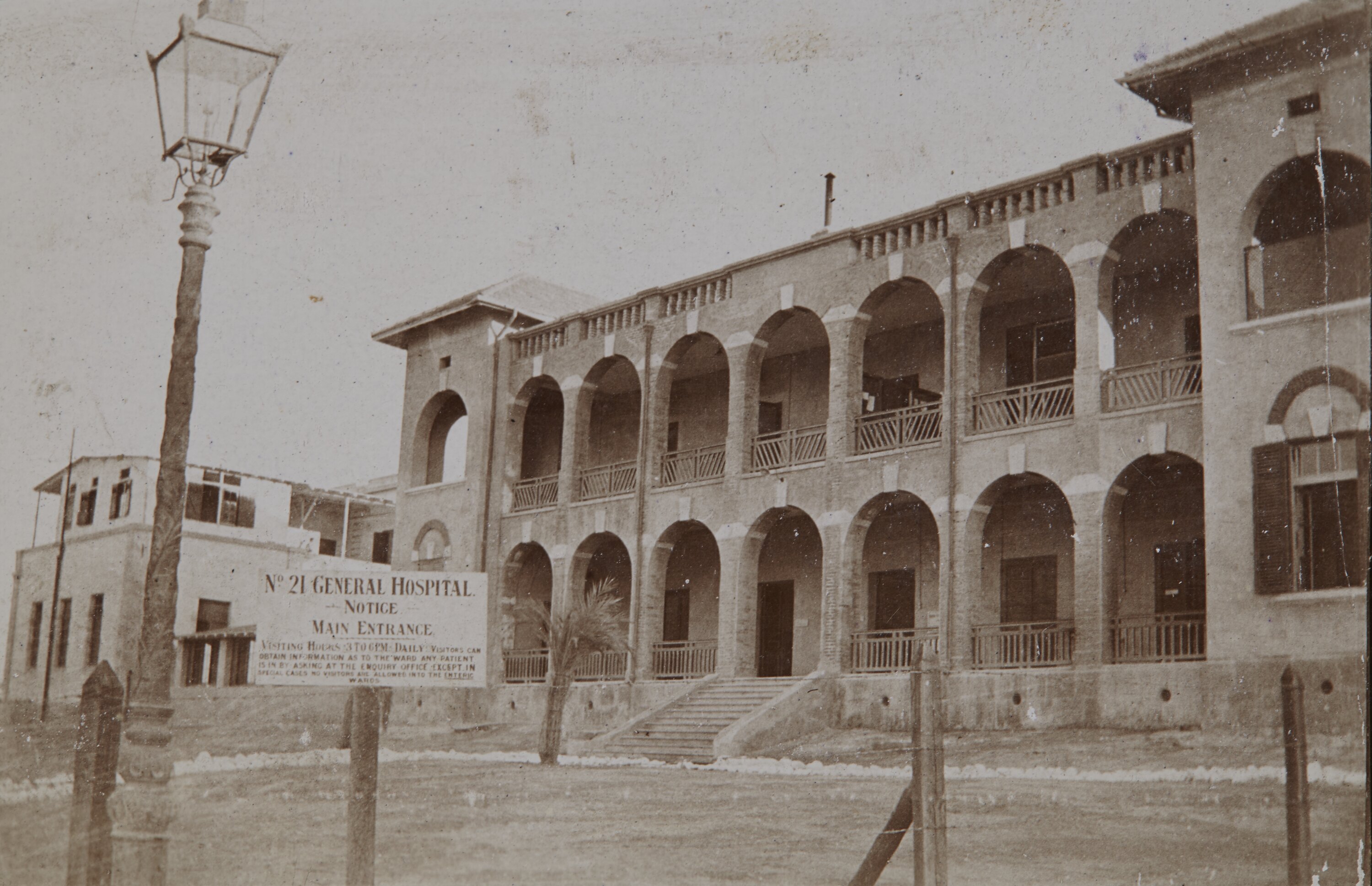 A two story brick and stone hospital is in the middle ground. Along the front on its two levels are wide verandas which form arcades, supported by square columns and semi-circular arches. In foreground is a gas lantern beside a notice saying that this is No 21 General Hospital. No visitors will be allowed without permission to enter the 'Enteric wards'.