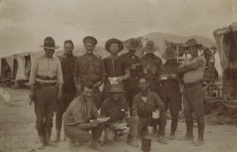 Soldiers off duty are formally posed after recently receiving letters from home. Eight soldiers stand in a line with three squatting in front, six of whom are holding letters or photographs. One man has a large enameled mug in one hand, in front of him on the ground is a blackened billy.