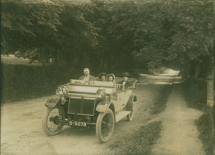 Black and white photograph mounted on brown card. Depicts scene of Mr. and Mrs. H.V. McKay with friends in a Lanchester motor car in Ireland in 1914.