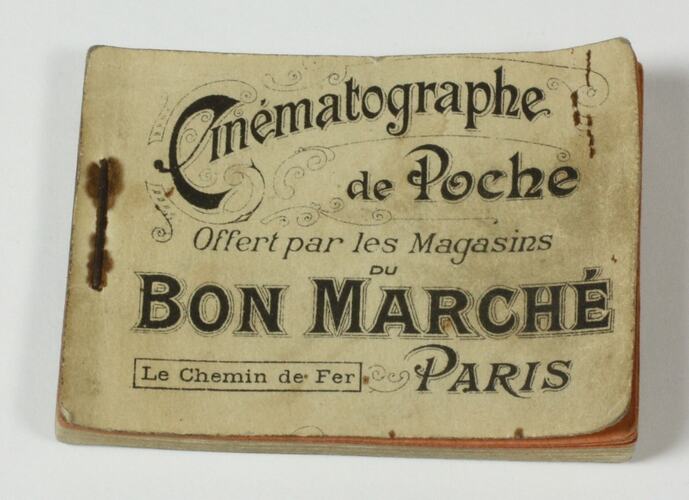 Flick book, produced in France for the department store Bon Marche, showing a photographic sequence of a man with a bicycle walking past a stationary train. If the viewer flicks the pages backwards the sequence is reversed, with the train pulling past the man. The flick book is made up of a number of pages, each having a related but slightly different static image drawn on them, which together record a sequence of movement. To create the animation the flick book is held in one hand, the thumb of the other hand flicks the pages in sequence, allowing the viewer to see each page in rapid succession.