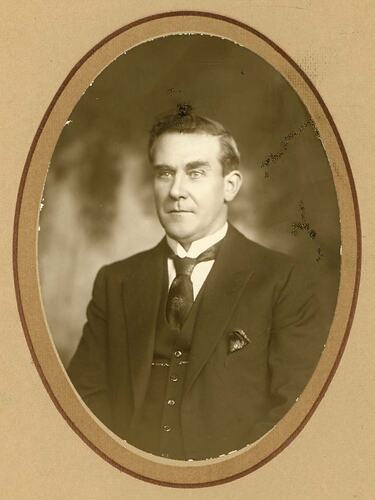 Black and white photograph of W. Southall, developer of 'Suntyne' Combined Drill and Cultivator at Sunshine Harvester Works where he worked for 50 years.