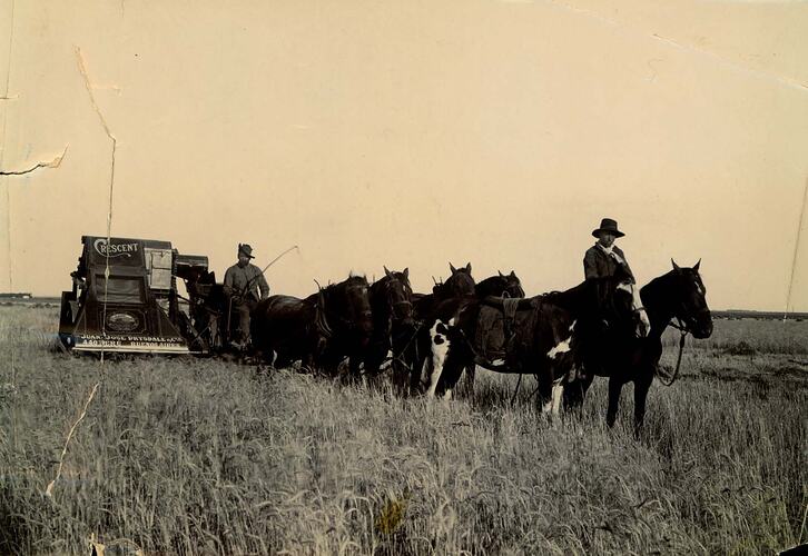 Harvester being operated in a field in Argentina. A man sits on the harvester whilst another sits on one of the six horses pulling the machine. The harvester is painted with sign writing that reads 'Crescent' on the front elevator cover and 'Juan y José Drysdale & Cía, 440 Peru Buenos Aires', on the front beater durm. On the lower elevator cover is an illustration labelled 'THE SUNSHINE HARVESTER' surrounded by the words 'The McKAY SUNSHINE HARVESTER WORKS / BALLARAT, VICTORIA'.