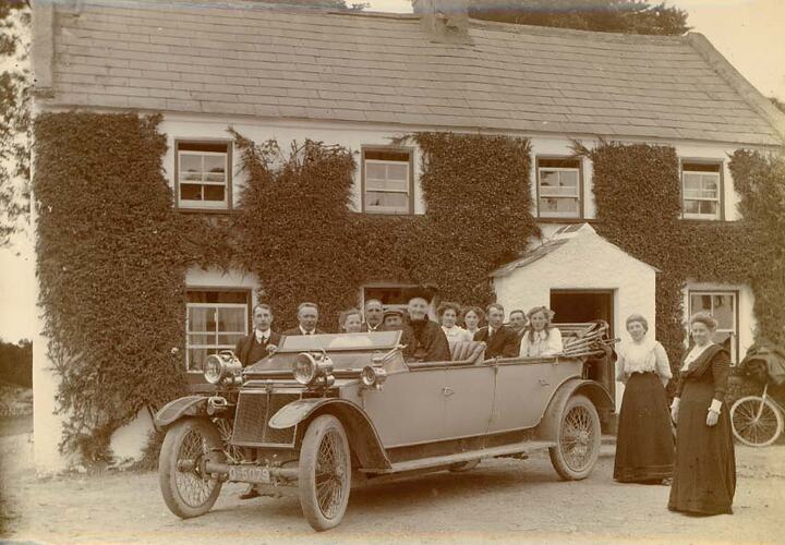 H.V. McKay and group standing beside a motor car. It is parked in front of a double storey, ivy-covered building in Ireland and dated 1912. Up to eight passengers sit in the front and rear seats of the vehicle. Motor car is possibly a Lanchester.