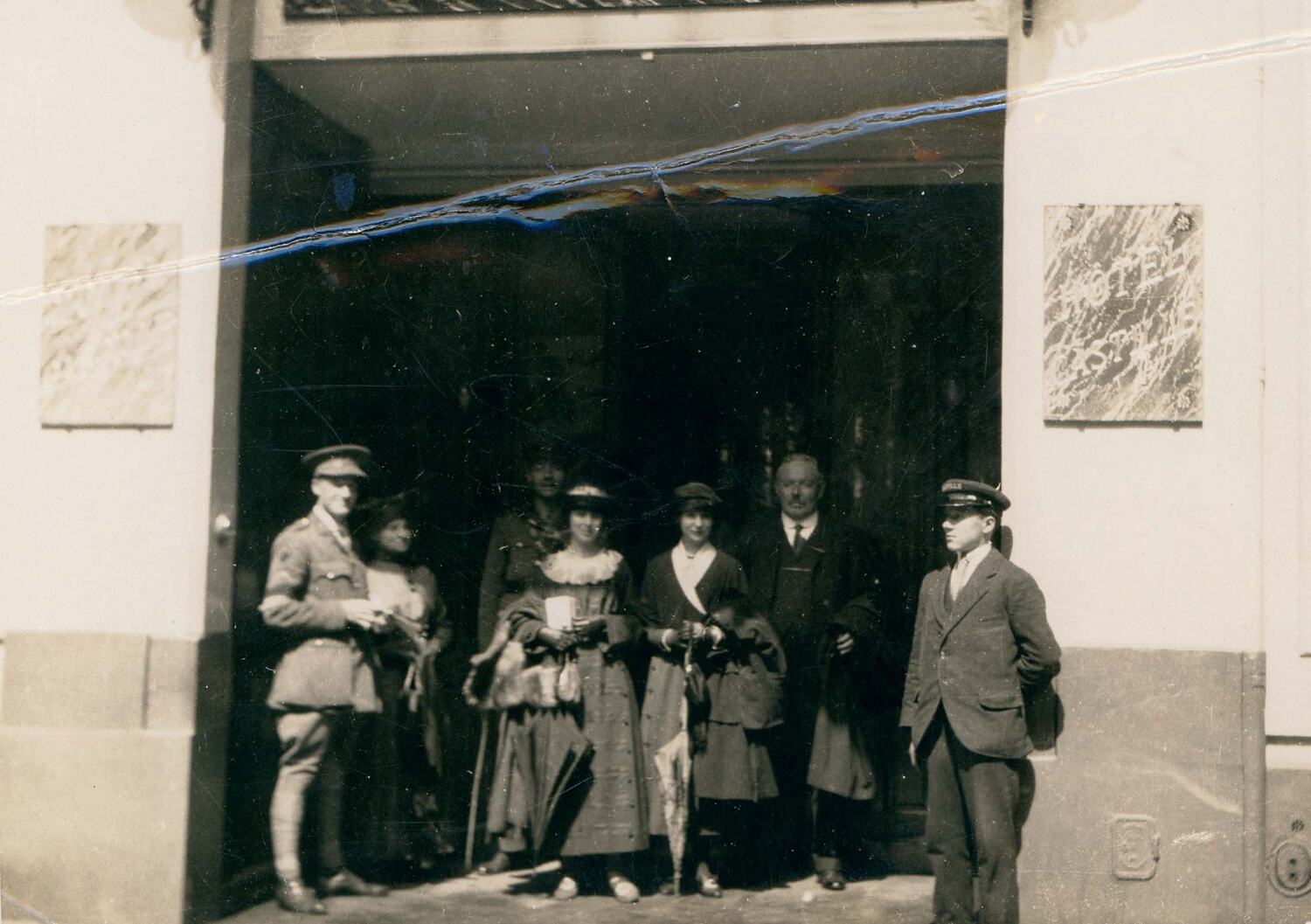 H.V. McKay and companions leaving Hotel Castille, Paris, on their return to England, First World War. Three women and three men, including H.V. McKay, pose in the entranceway of the building. Two of the men are in military attire. A hotel attendant stands to the right of the doorway, near a plaque bearing the hotel's name.