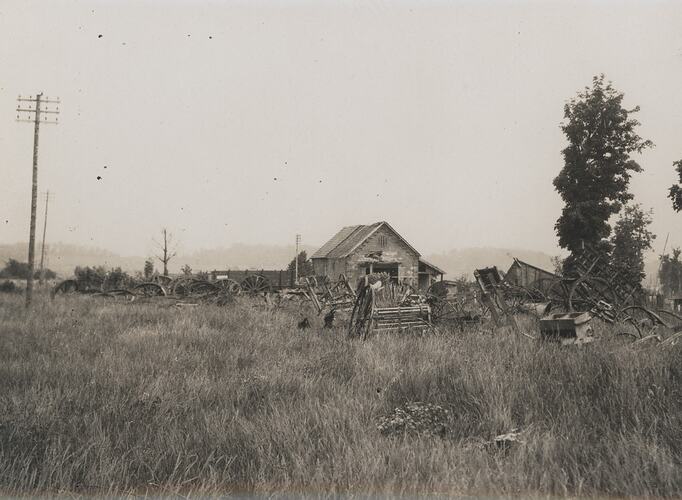 Depot of Abandoned Agricultural Machinery, near Peronne, France, First World War. A derelict brick building, located in an overgrown grassy field, is surrounded by agricultural machinery, namely wheels and carts.