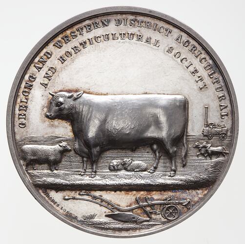 Cattle with sheep, harnessed horses and portable engine in backgound. Around top : GEELONG AND WESTERN DISTRICT AGRICULTURAL / AND HORTICULTURAL SOCIETY. In exergue, plough, around, PINCHES, LONDON