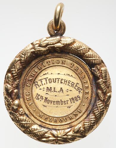 Exhibition Building Trustee's medal belonging to R.T. Toutcher, MLA, inscribed 16th November 1909.