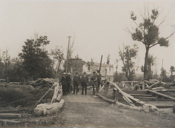 Bridge at Feuilleres, River Somme, Where Australians Crossed, France, First World War. Group of seven people, including H.V. McKay, stand on a wooden bridge posing for the photograph. Construction material, trees and a ruined building are in the background.