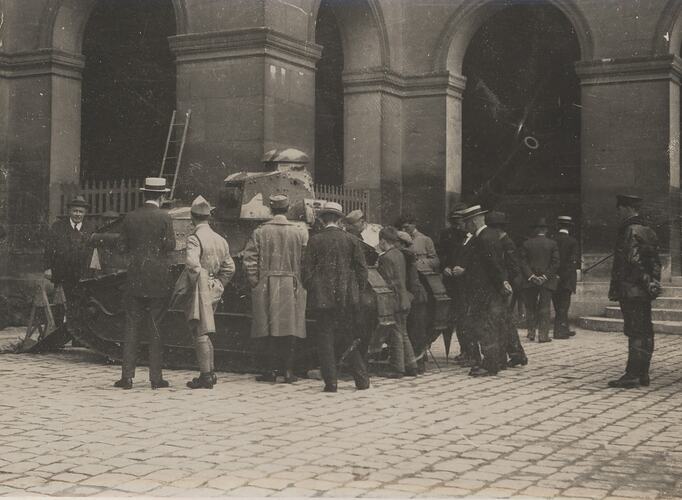 French Renault FT17 tank in courtyard of the Invalides, Paris, France, First World War. Onlookers surround the tank, positioned on a paved courtyard beside a building with numerous archways. H.V. McKay can be seen standing to the left of the tank, facing the camera.