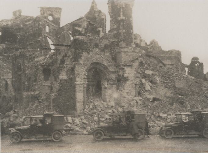 Cathedral at Albert, France, First World War. Blurry scene of a destroyed cathedral with the remains of several archways, walls and a tower visible. Three motor cars can be seen on the road in front of the cathedral.