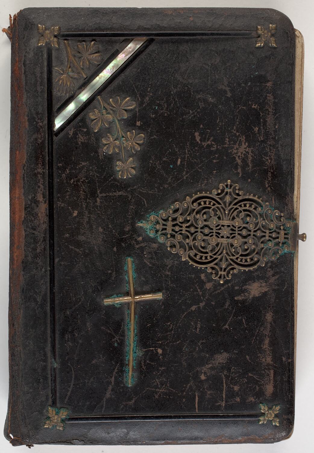 Small brown leather covered Lutheran prayer book with metal embossed decorative clasp, cross and other decoration. Date inscribed on back cover '1914'.