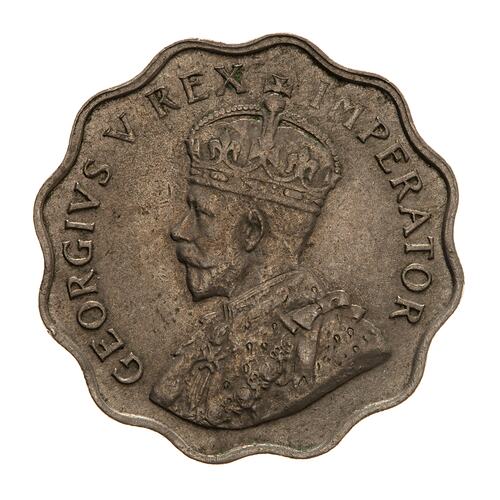 Crowned and draped bust of the King facing left, the King is wearing the Imperial Crown and the ermine Robe of State, the Collar of the Most Noble Order of the Garter, and the Badge of the Most Honourable Order of the Bath; around, GEORGE V REX IMPERATOR; on bust truncation, the artist's initials, BM