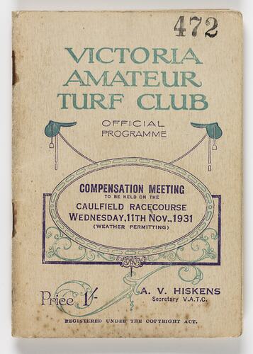 Text printed on front cover: 472/VICTORIA/AMATEUR/TURF CLUB/OFFICIAL/PROGRAMME/COMPENSATION MEETING/TO BE HELD ON THE/CAULFIELD RACECOURSE/WEDNESDAY, 11TH NOV., 1931/(WEATHER PERMITTING).