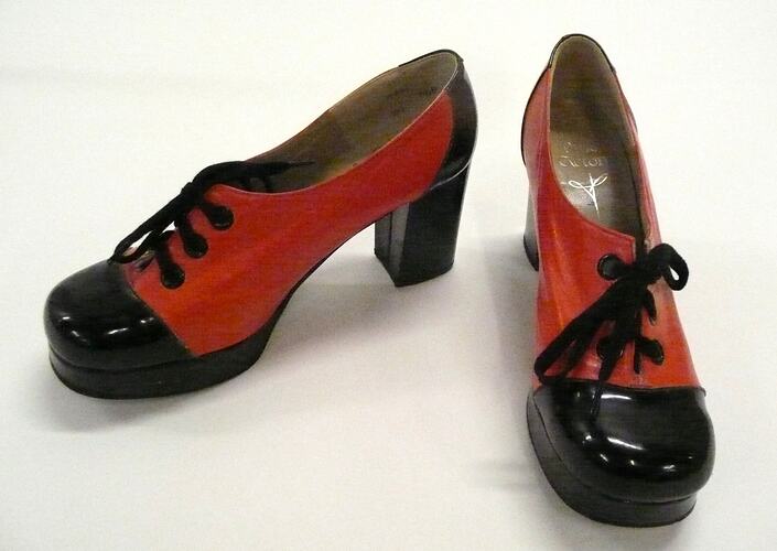 A pair of woman's platform shoes consisting of a red leather upper with black patent leather around the heel and toe areas, with three pairs of black metal eyelets along the opening. It has a 8.5 cm high heel, and 2 cm platform along the front of the shoe, both covered in black patent leather. Both heels have had a later addition of a black `Neolite' protector nailed onto the bottom. The inside of the shoes are lined with beige leather.