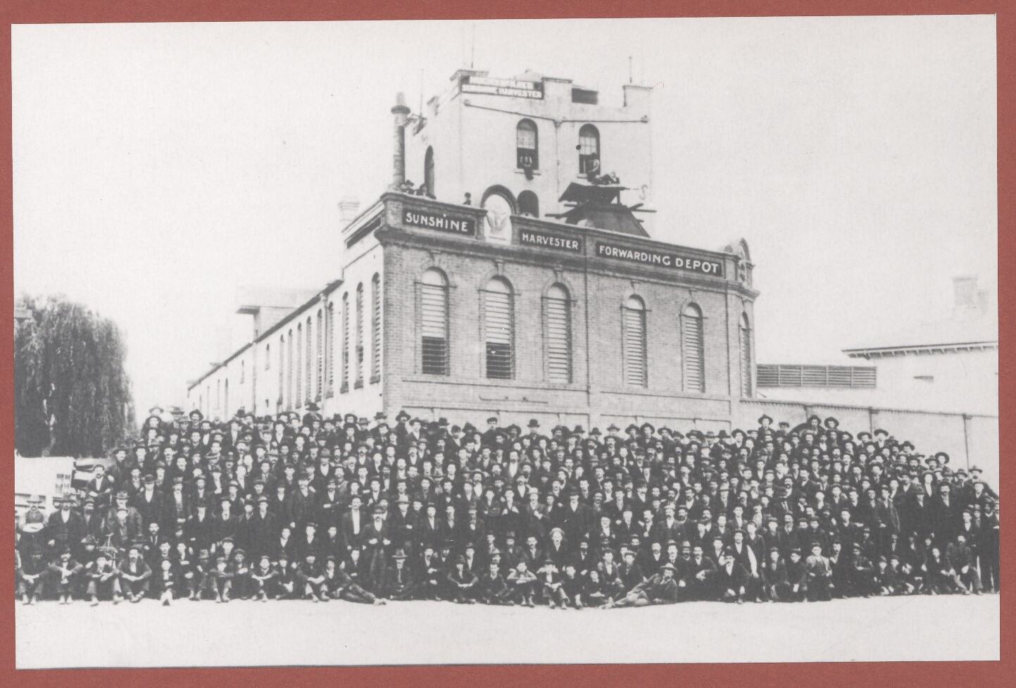 Workers standing out the front of the Sunshine Harvester Forwarding Depot, Ballarat.