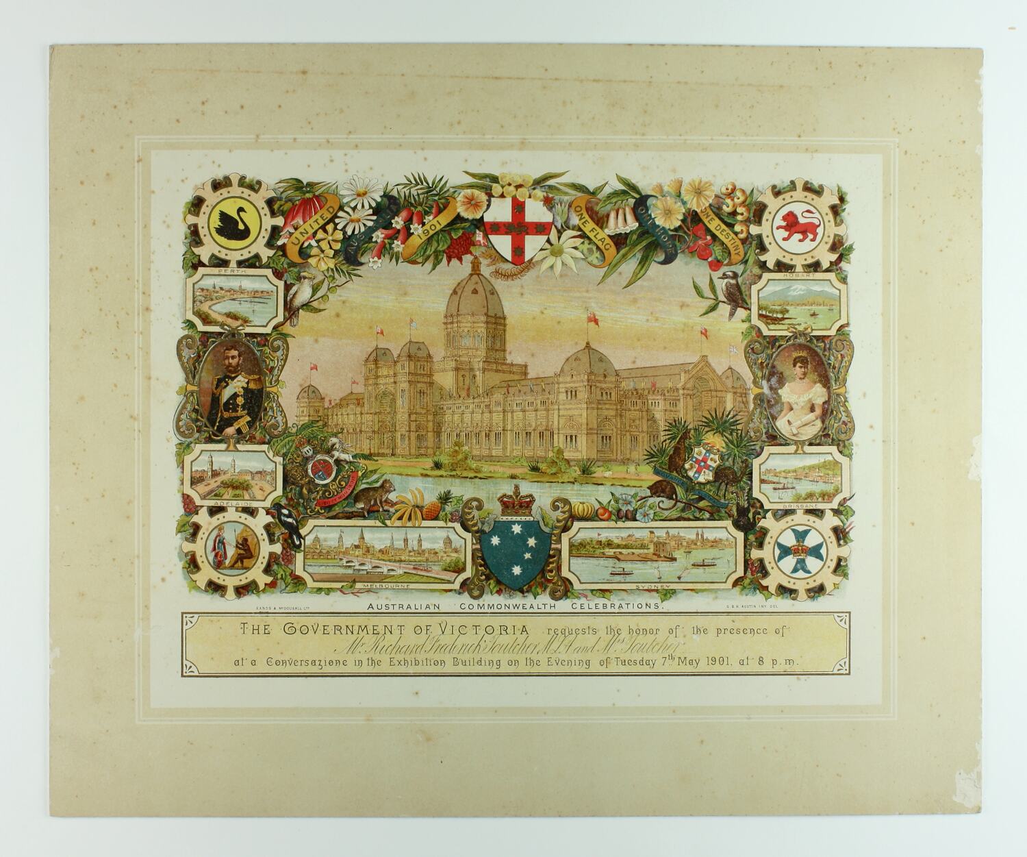 Front, printed. gold ink: "AUSTRALIAN COMMONWEALTH CELEBRATIONS / THE GOVERNMENT OF VICTORIA requests the honour of the presence of / Mr Richard FrederichToutcher M.L.A. and Mrs Toutcher / at a Conversazione in the Exhibition Building on the Evening of Tuesday 7th May, 1901, at 8 p. m. / SANDS & MCDOUGALL LTD. G.B.H. AUSTIN INY. DEL."