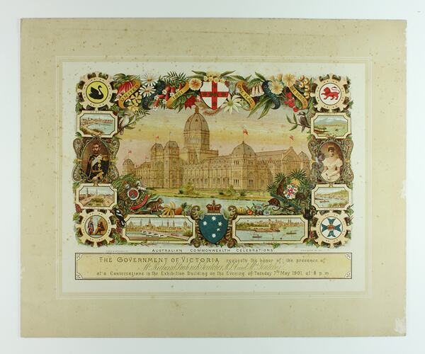 Coloured invitation printed on card to a Conversazione, an evening event held in the Exhibition Building on the evening of Tuesday 7 May 1901 as part of the Australian Commonwealth Celebrations. The invitation was sent to Mr Richard Frederich Toutcher M.L.A. and Mrs Toutcher.