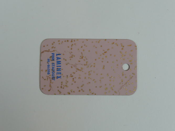 Laminex sample swatch, rectangular in shape, with rounded corners and a small circular hole cut into the top of the sample. Sample is double sided with a colour name printed across the bottom of each side. Pink with gold glitter flecks and brown marbled lines on front; plain dull gold colour on reverse. Sample has been removed from a group of 38 sample swatches hung on a silver metal chain.