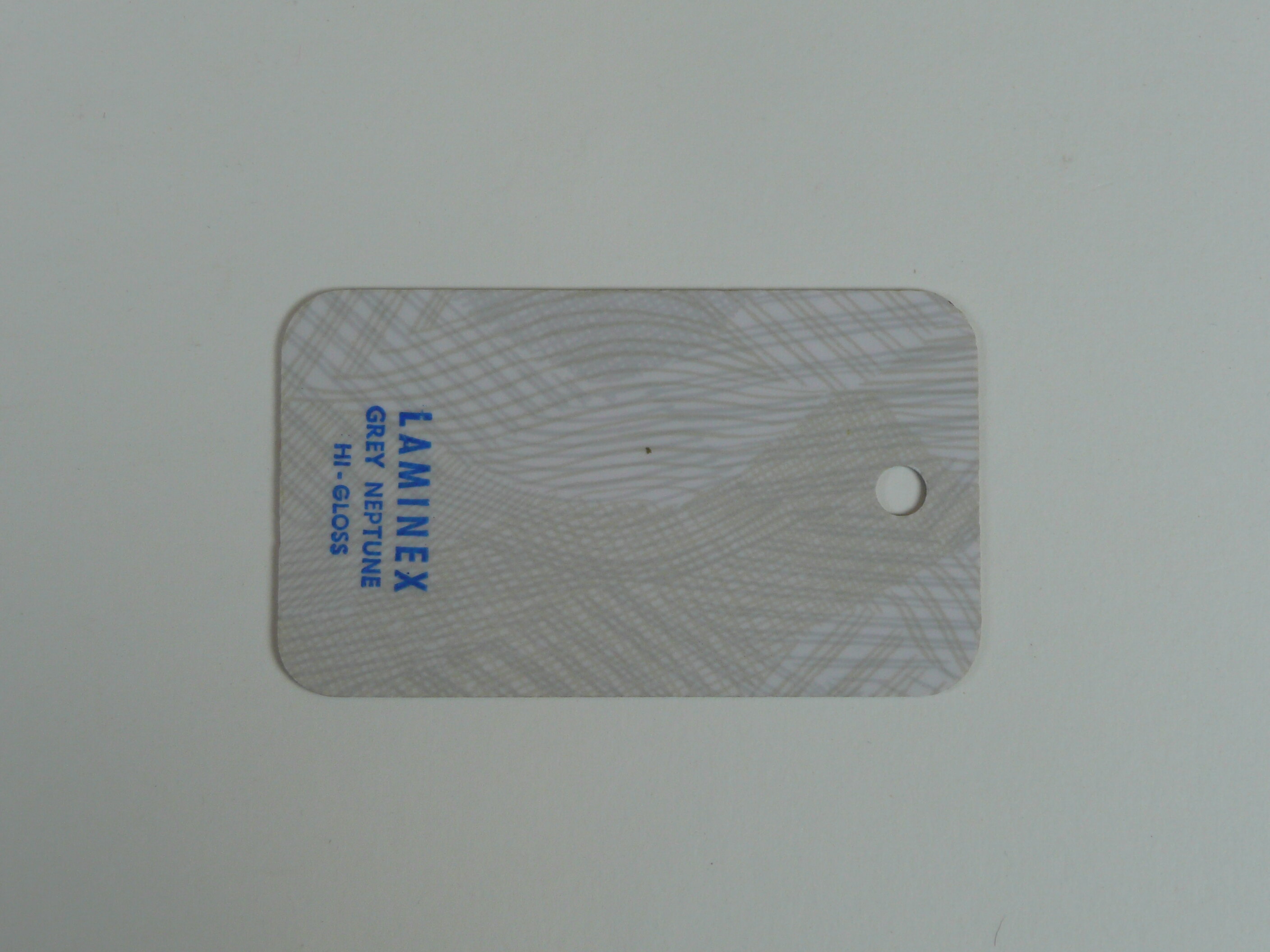 Printed on front with blue ink: 'LAMINEX / GREY NEPTUNE / HI-GLOSS' Printed on reverse with blue ink: 'LAMINEX / VOGUE / HI-GLOSS'