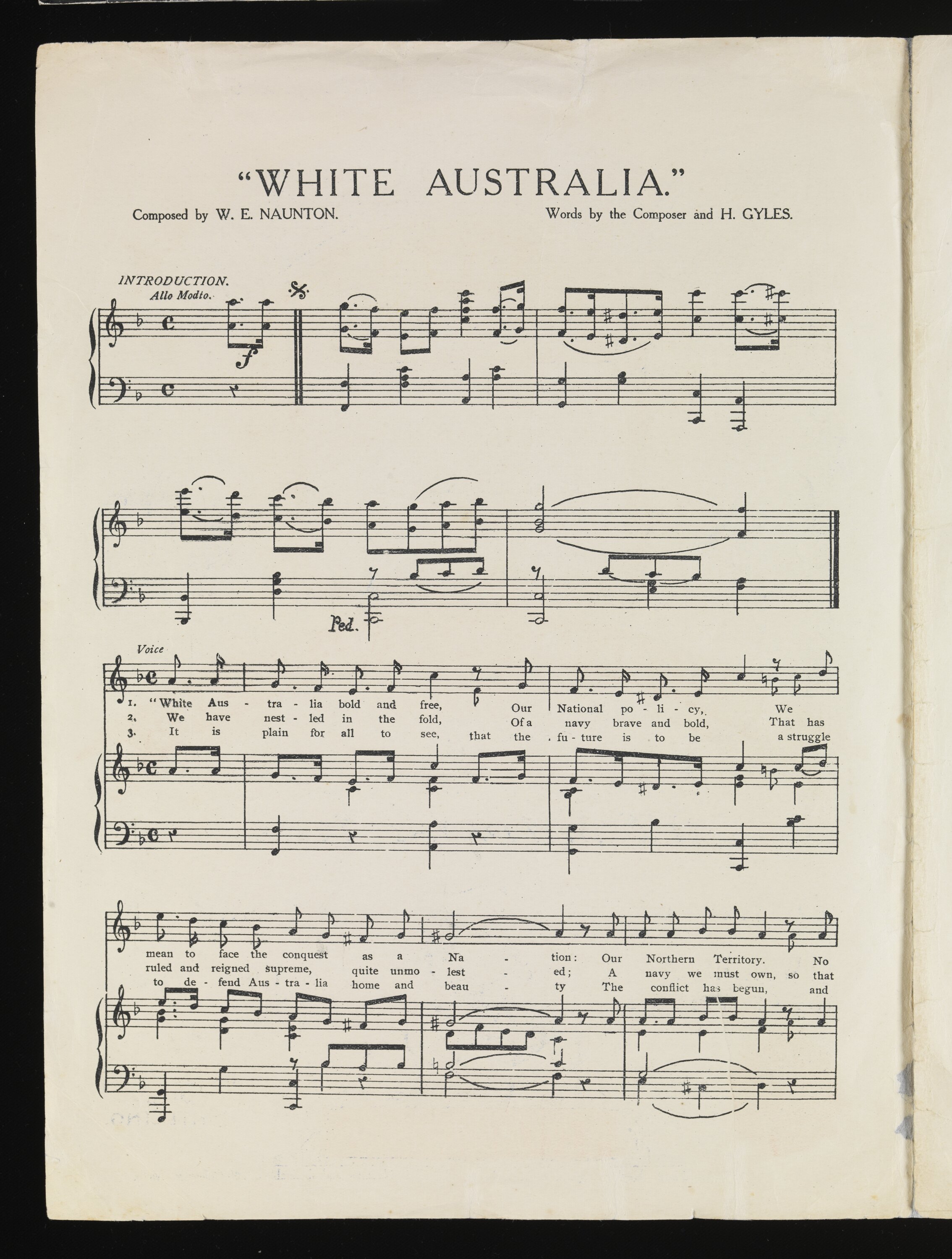 Printed on front cover: 'THE GREAT NATIONAL POLICY SONG / WHITE AUSTRALIA / ADVANCE AUSTRALIA / ANA. / Australia! Australia! / Sunny south of Old Britannia's sons, / Australia, the white man's land, / Defended by the white man's guns, / Australia! Australia! / For Anglo Saxon race and Southern Cross, / God bless and help us to protect / Our glorious land Australia. / AUSTRALIA THE WHITE MAN'S LAND / Dedicated by the / composer / to / THE AUSTRALIAN NATION / FEATURED and SUNG AT THE A.N.A. NATIONAL FETE, JANUARY 31st 1910, / SIR THOMAS GIBSON - CARMICHAEL, Bart., K.C.M.G. / THE NATIONAL SONG / MUSIC BY W.E. NAUNTON / WORDS BY / THE COMPOSER & H.J.W. GYLES / NAUNTON / MELB. / COLLEGE. / W.E. NAUNTON / Published for the Composer by / A. M. DINSDALE, / 105 - 107 BOURKE ST. MELBOURNE / This Song is published in the Keyboard System of Music invented by - W.E. NAUNTON, and obtainable at 145 Collins St. Melb.' Reverse printed in blue ink: 'A GREAT AND SUCCESSFUL AUSTRALIAN / MUSICAL INVENTION / Naunton College of Music, / 145 COLLINS STREET, MELBOURNE / Established 1904' Extensive text follows.