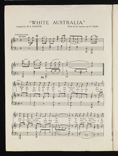 6 page sheet music, with central spine fold and 1 loose central page. Cream paper with illustrated front cover in primarily blue, red and yellow titled: 'THE GREAT NATIONAL POLICY SONG. WHITE AUSTRALIA. AUSTRALIA THE WHITE MAN'S LAND. THE NATIONAL SONG.' Includes Commonwealth of Australia coat of arms with words 'ADVANCE AUSTRALIA ANA' underneath; white map of Australia with song chorus; images of Sir T. Gibson-Carmichael, K.C.B, State Governor of Victoria, His Excellency the Earl of Dudley, Governor-General of the Commonwealth and W.E.Naunton the composer. The cover also states that the song was 'featured and sung at the ANA National Fete, January 31st, 1910.' Published by A.M. Dinsdale,105-107 Bourke Street Melbourne. Inside pages contain music and lyrics for 'White Australia', composed by W.E. Naunton and words by composer and H. Gyles. The song consists of 3 verses and a chorus. Rear cover