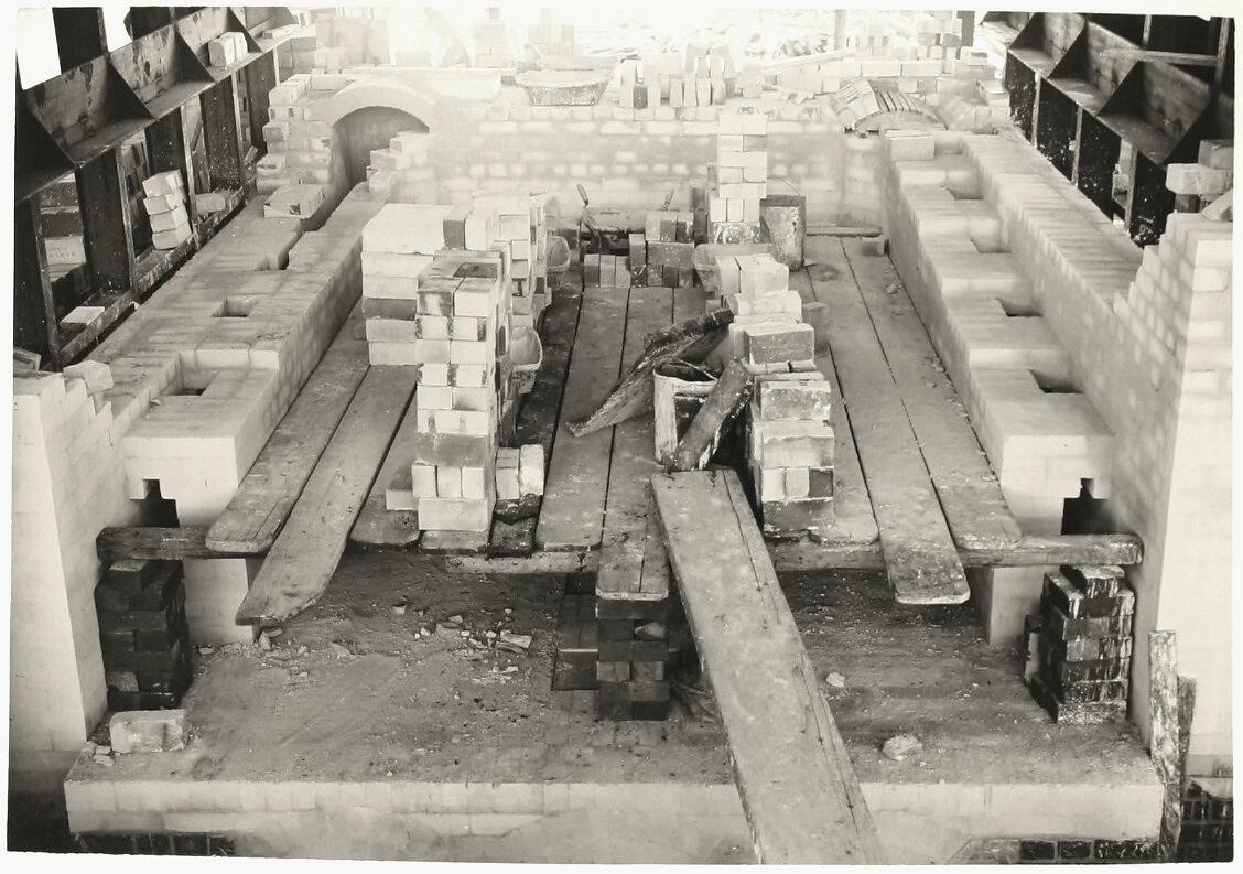Extension of the McKay Massey Harris welding plant, Sunshine, December 1941. Partially built brick construction located within a larger building. Three partial brick walls contain smaller alcoves and wooden walking planks.Two arches are visible in the back section.