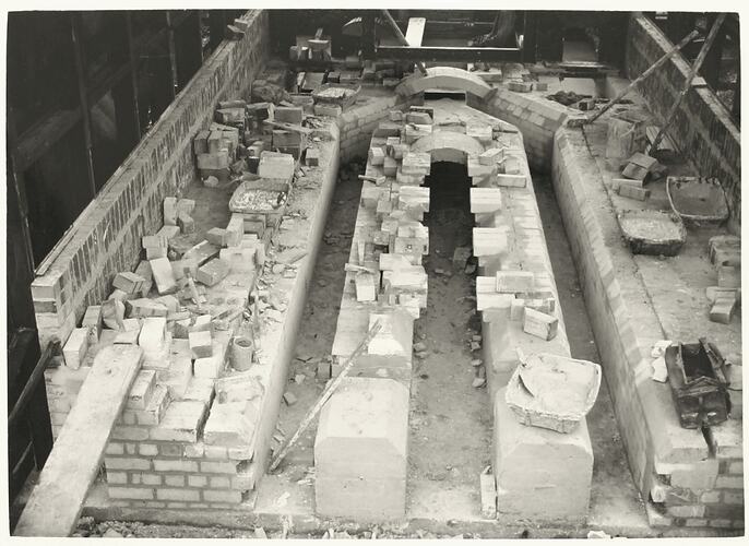 Extension of the McKay Massey Harris welding plant, Sunshine, December 1941. Partially built brick construction with a raised u-shaped central platform. There are two raised platforms either side that meet at the top via an archway. Stacked bricks, rubble and tools are on the platforms and ground.