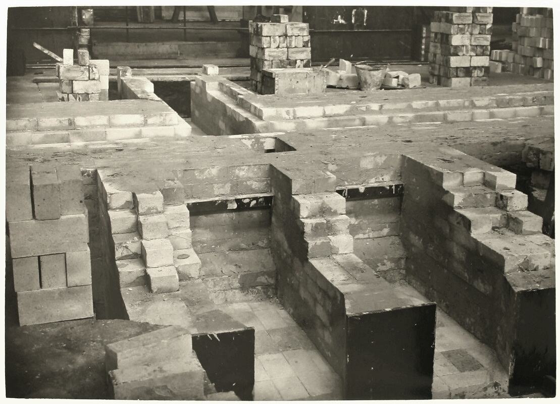 Extension of the McKay Massey Harris welding plant, Sunshine, December 1941. Partial construction of three vertical staggered brick sections that connect a lower brick section to a higher brick platform.