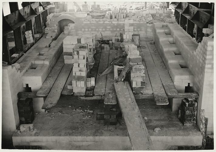Extension of the McKay Massey Harris welding plant, Sunshine, December 1941. Partially built brick construction located within a larger building. Three partial brick walls contain smaller alcoves, wooden walking planks and stacked bricks.Two arches are visible in the back section.