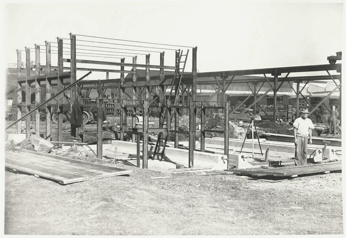 Extension of the McKay Massey Harris welding plant, Sunshine, August 1940. Metal framework of a partially constructed building. Surveying equipment and two men stand at the right of the scene.