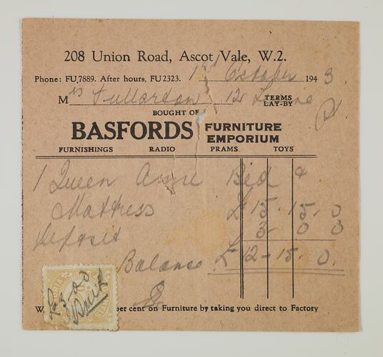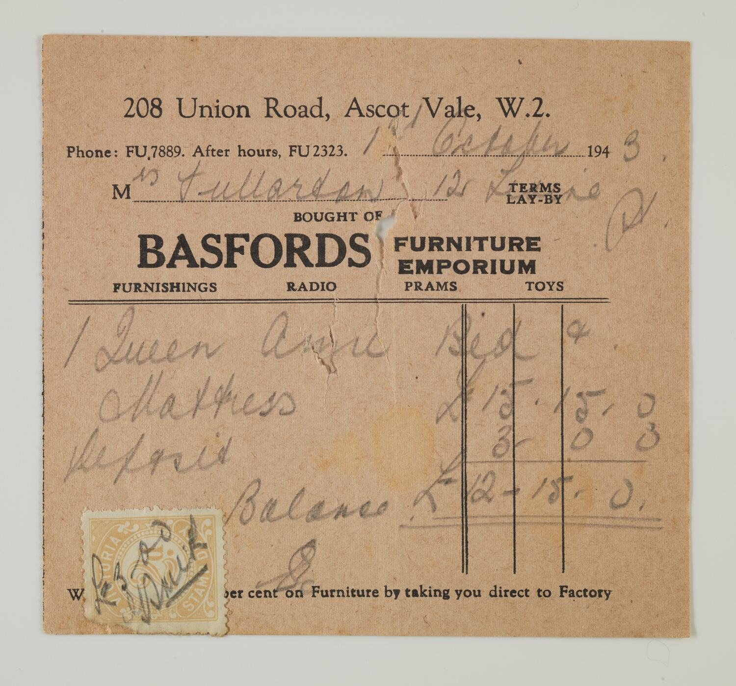 The receipt is from Basfords Furniture Emporium to Mrs Fullarton for a deposit on one queen size bed and mattress costing a total of £15.15.0 (known from 19) receipt) in 1943. Basfords office was at 208 Union Road, Ascot Vale.