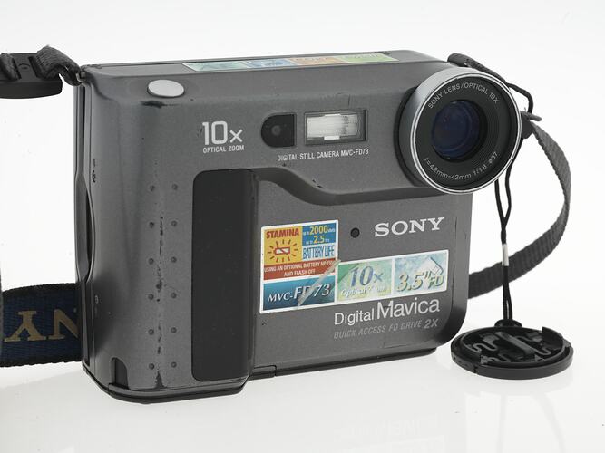 Printed on colour stickers, top of camera 'Program AE'; 'Picture Effects'; 'Copy'; 'Email'. Printed on colour stickers on front of camera 'STAMINA up to 2000 shots / up to 2.5 hrs/ BATTERY LIFE / USING AN OPTIONAL BATTERY NP-F550 AND FLASH OFF / MVC-FD73'; '10 X Optical Zoom'; '3.5: FD'. Printed on camera, front , silver lettering '10 x OPTICAL ZOOM" / DIGITAL STILL CAMERA MVC-FD73" / SONY / Digital Mavica / QUICK ACCESS FD DRIVE 2 X'. Printed on camera, back, printed, silver lettering ' POWER ON / OFF / BRIGHT / SONY / FLASH / PLAY / CAMERA / ACCESS / PICTURE EFFECT' and further associated text. Further text on side and top of camera body. Woven into fabric strap, grey lettering ' SONY'.